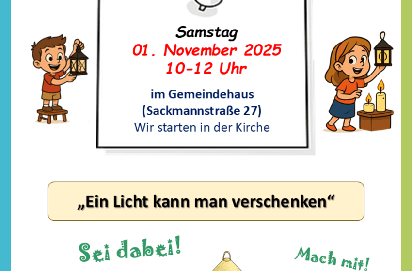 Liebe Kinder wir laden euch ein! Zu unserer Kinderkirche am Samstag, den 01. November 2025. Sie findet im Gemeindehaus (Sackmannstr. 27) statt. Wir beginnen in der Kirche um 10 Uhr und werden ...