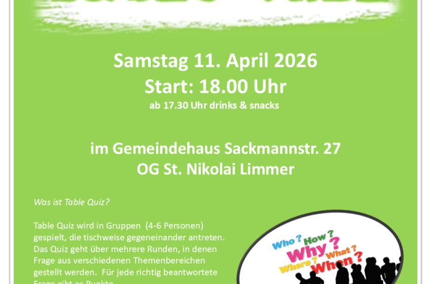 Lust auf Table Quiz?! Ja? Dann seid dabei! Samstag, 11. April 2026 Start: 18 Uhr ab 17.30 Uhr: drinks & snacks im Gemeindehaus Sackmannstr. 27 Table-Quiz wird in Gruppen (4 bis 6 Personen) ...