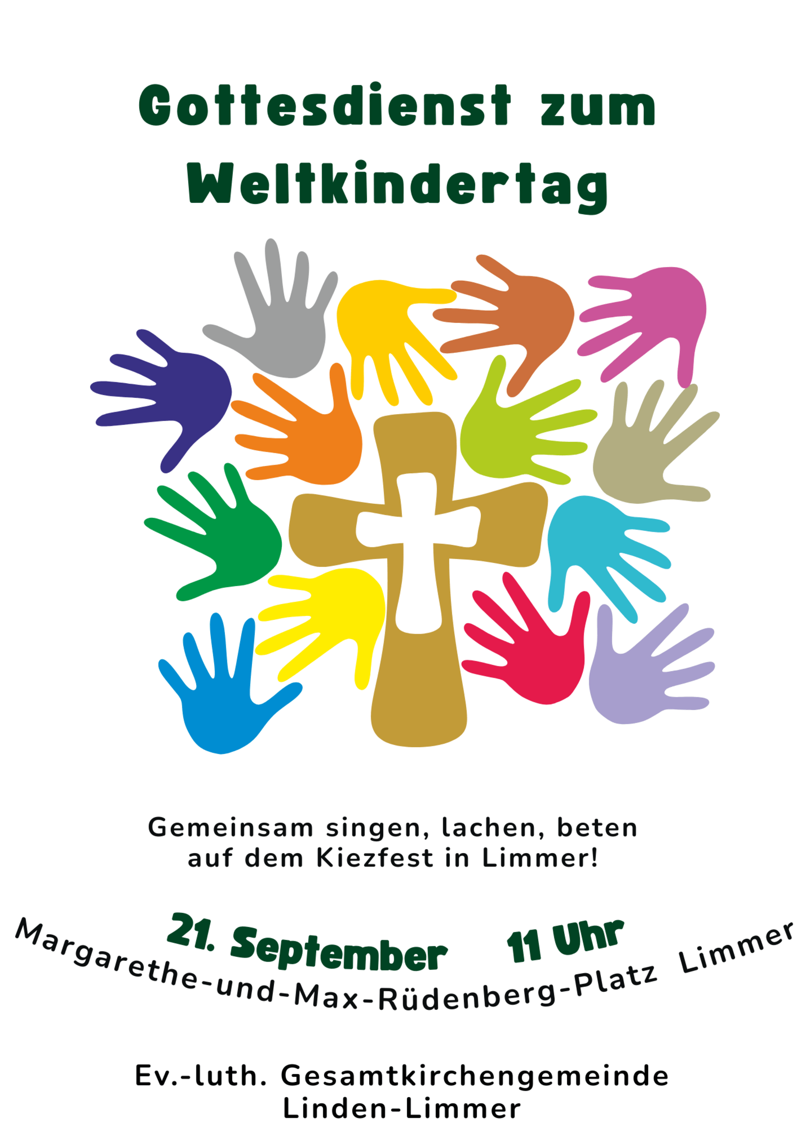 Am Sonntag, den 21. September 2025 um 11 Uhr feiern wir einen bunten, lebendigen Familiengottesdient zum Weltkindertag auf dem Kiezfest