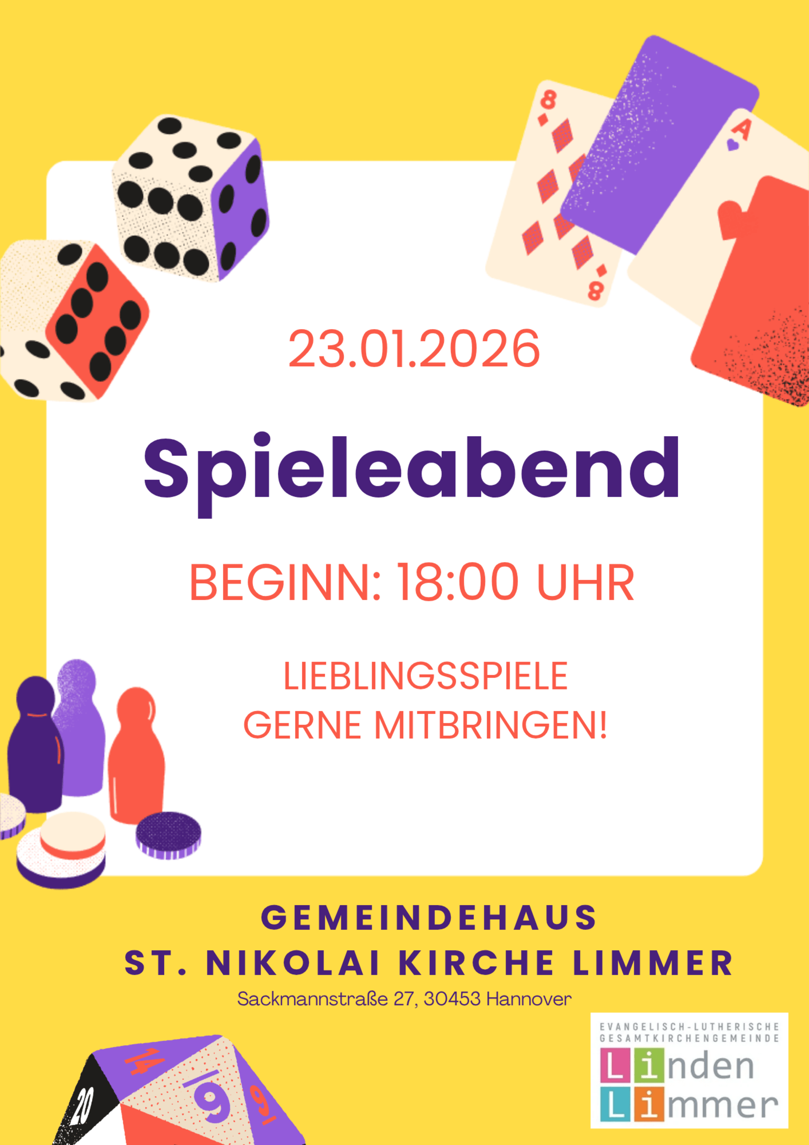 Am Freitag 23. Januar 2025 findet ab 18 Uhr ein Spieleabend im Gemeindesaal der St. Nikolai Kirche (Sackmannstr. 27) statt.